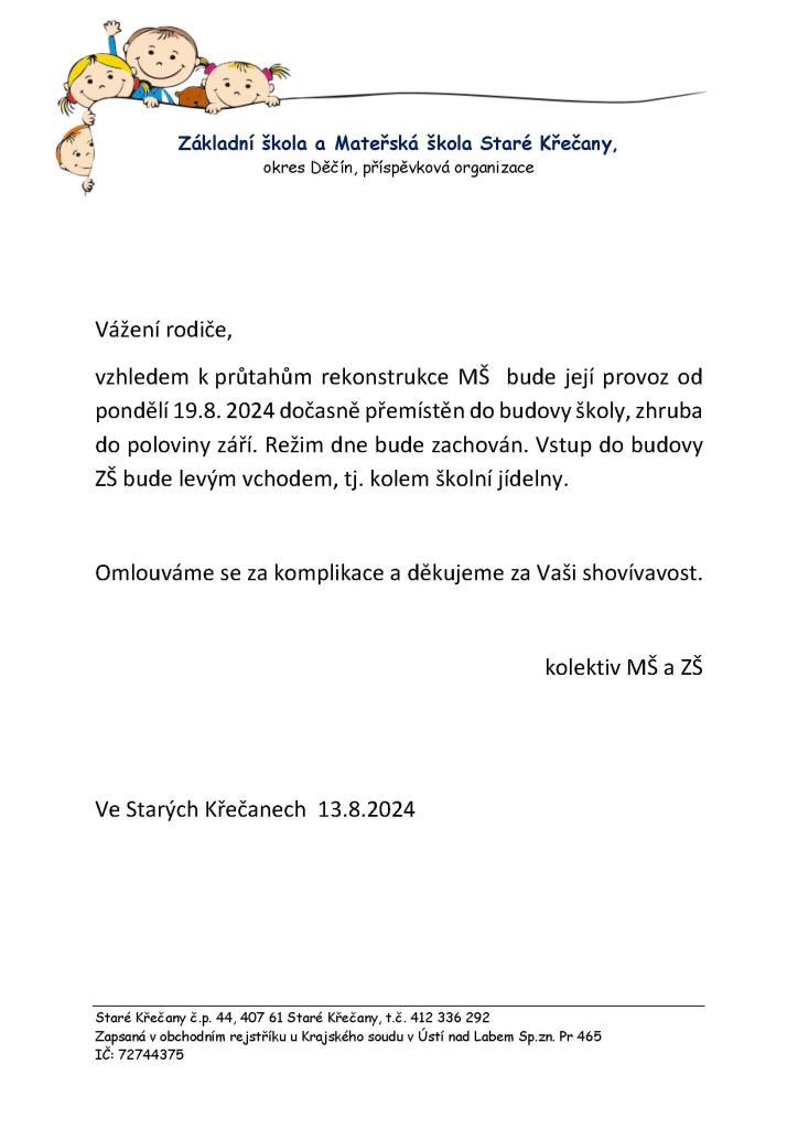 Provoz MŠ Staré Křečany
