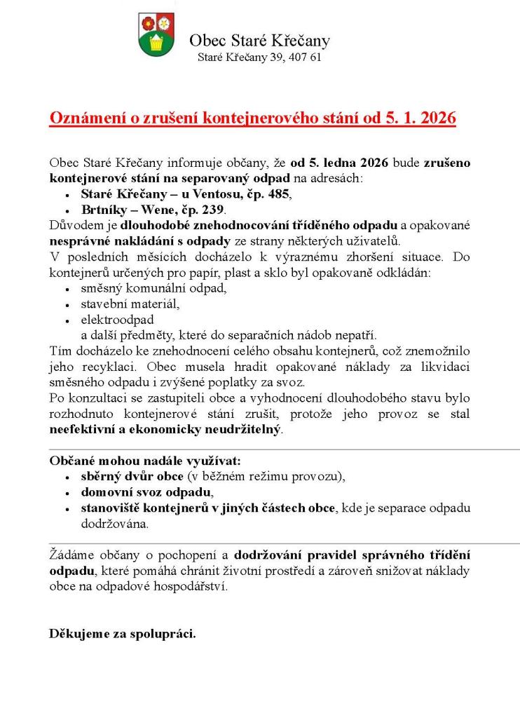 Informace o zrušení vybraných kontejnerových stání.